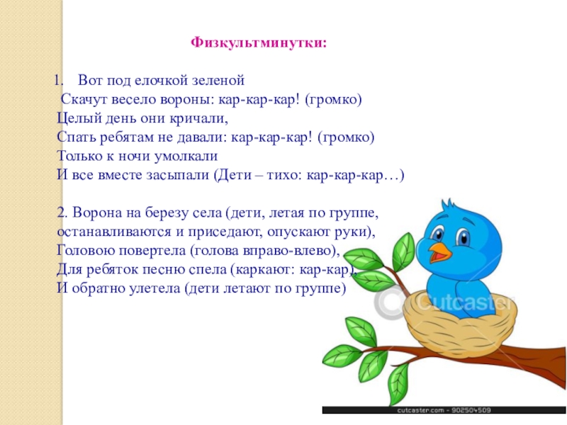 2. Ворона на березу села (дети, летая по группе, останавливаются и приседают, опускают руки),