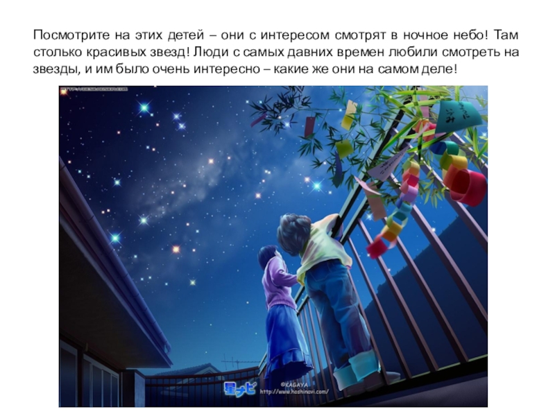 Посмотрите на этих детей – они с интересом смотрят в ночное небо! Там столько красивых звезд! Люди с самых давних времен любили смотреть на звезды, и им было очень интересно – какие же они на самом