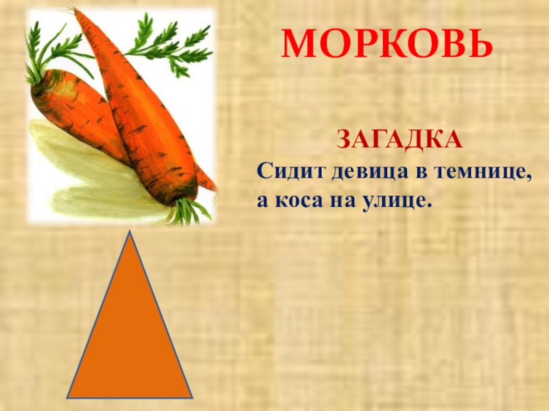 ЗАГАДКАСидит девица в темнице, а коса на улице.МОРКОВЬ