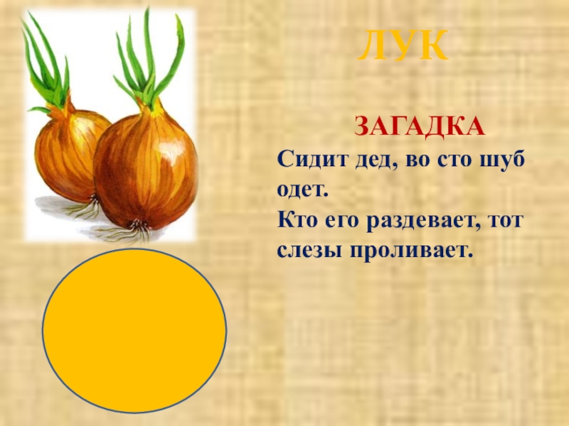 ЗАГАДКАСидит дед, во сто шуб одет. Кто его раздевает, тот слезы проливает.ЛУК