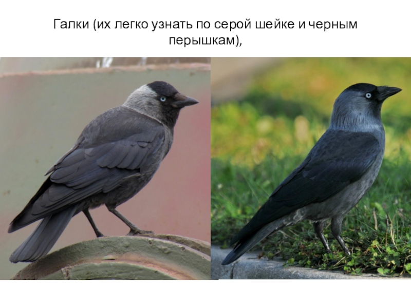 Слайд 7Галки (их легко узнать по серой шейке и черным перышкам),