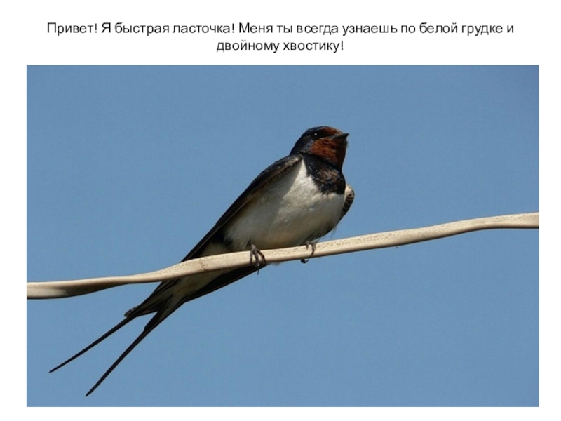 Слайд 2Привет! Я быстрая ласточка! Меня ты всегда узнаешь по белой грудке