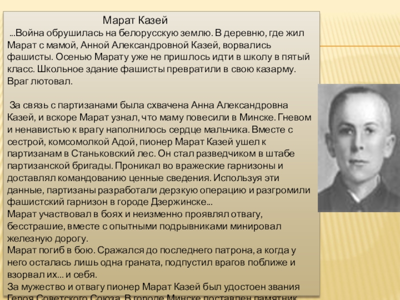 ...Война обрушилась на белорусскую землю. В деревню, где жил Марат с мамой, Анной Александровной Казей, ворвались фашисты. Осенью Марату уже не пришлось идти в школу в пятый класс. Школьное здание фашисты превратили в свою казарму. Враг лютовал.
