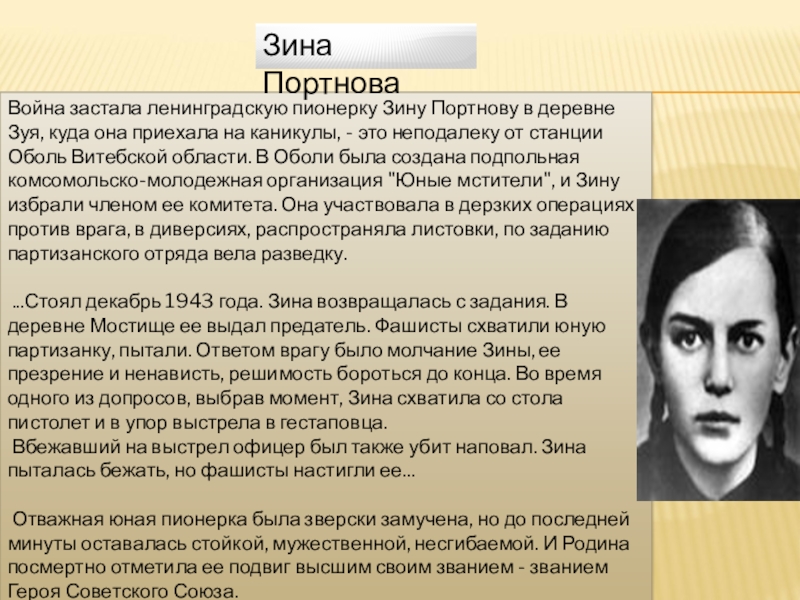 Слайд 9Война застала ленинградскую пионерку Зину Портнову в деревне Зуя, куда она
