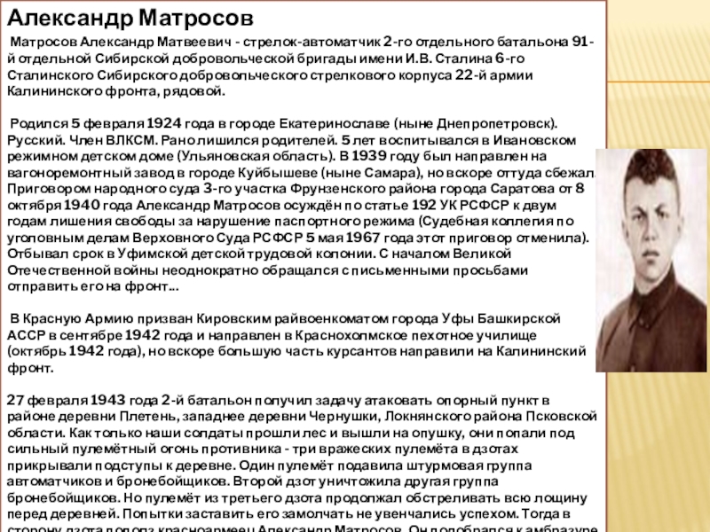 Матросов Александр Матвеевич - стрелок-автоматчик 2-го отдельного батальона 91-й