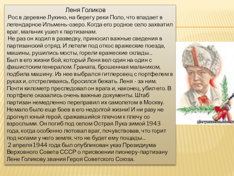 2 апреля 1944 года был опубликован указ Президиума Верховного Совета СССР о присвоении пионеру-партизану Лене Голикову звания Героя Советского Союза.