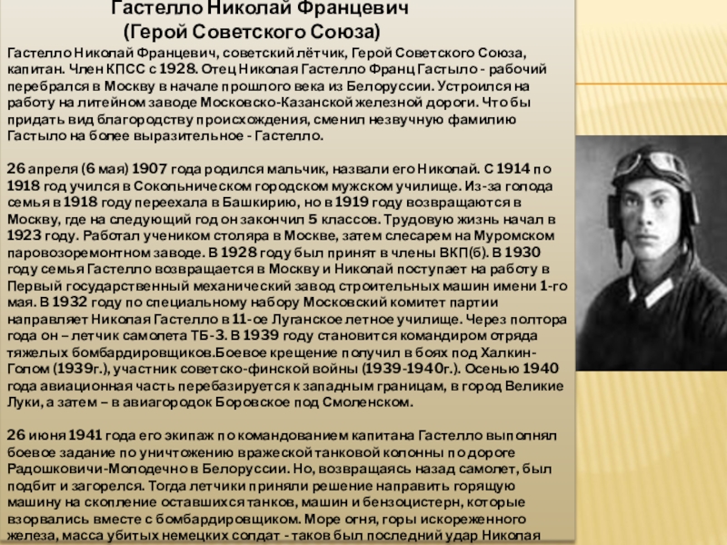 Гастелло Николай Францевич, советский лётчик, Герой Советского Союза, капитан. Член КПСС с 1928. Отец Николая Гастелло Франц Гастыло - рабочий перебрался в Москву в начале прошлого века из Белоруссии. Устроился на работу на литейном заводе Московско-Казанской железной дороги. Что бы придать вид благородству происхождения, сменил незвучную фамилию Гастыло на более выразительное - Гастелло.