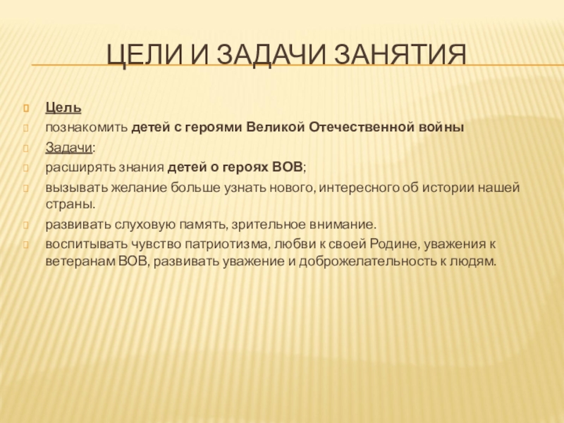 воспитывать чувство патриотизма, любви к своей Родине, уважения к ветеранам ВОВ, развивать уважение и доброжелательность к людям.