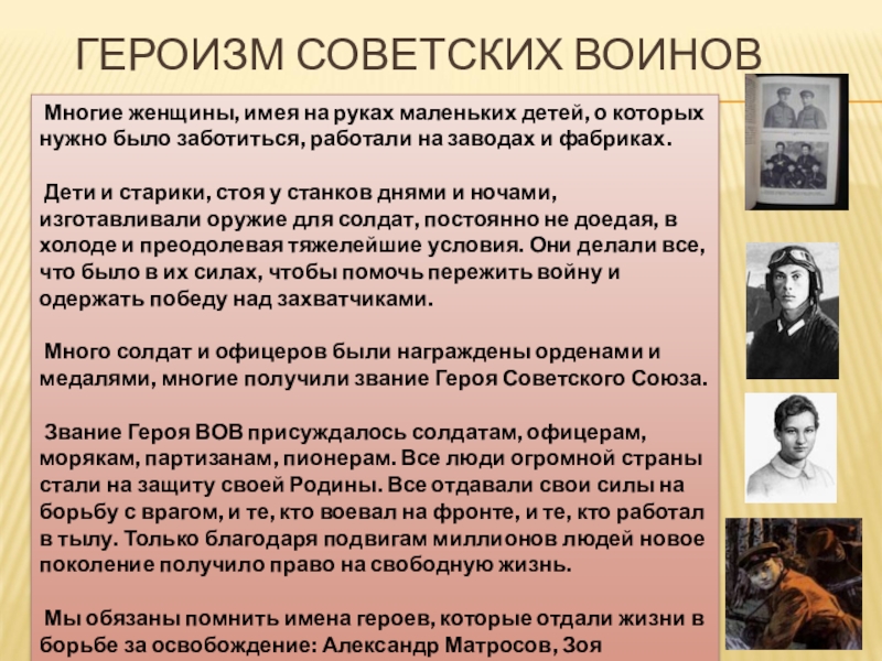 Звание Героя ВОВ присуждалось солдатам, офицерам, морякам, партизанам, пионерам. Все люди огромной страны стали на защиту своей Родины. Все отдавали свои силы на борьбу с врагом, и те, кто воевал на фронте, и те, кто работал в тылу. Только благодаря подвигам миллионов людей новое поколение получило право на свободную жизнь.