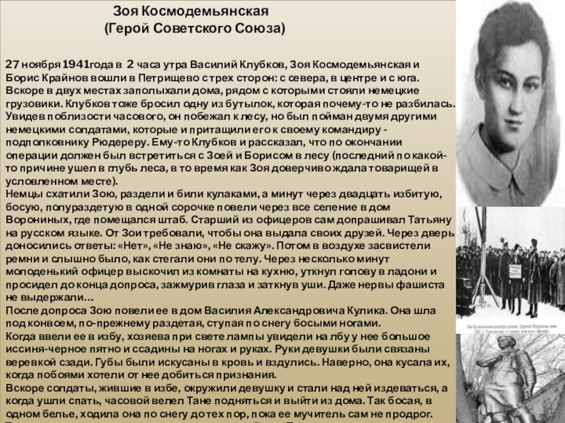 Немцы схатили Зою, раздели и били кулаками, а минут через двадцать избитую, босую, полураздетую в одной сорочке повели через все селение в дом Ворониных, где помещался штаб. Старший из офицеров сам допрашивал Татьяну на русском языке. От Зои требовали, чтобы она выдала своих друзей. Через дверь доносились ответы: «Нет», «Не знаю», «Не скажу». Потом в воздухе засвистели ремни и слышно было, как стегали они по телу. Через несколько минут молоденький офицер выскочил из комнаты на кухню, уткнул голову в ладони и просидел до конца допроса, зажмурив глаза и заткнув уши. Даже нервы фашиста не выдержали…