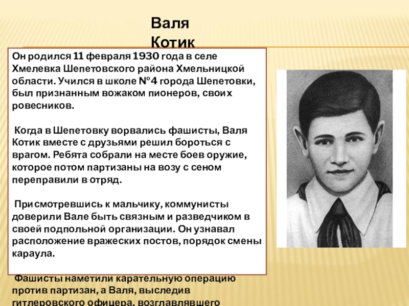 Когда в Шепетовку ворвались фашисты, Валя Котик вместе с друзьями решил бороться с врагом. Ребята собрали на месте боев оружие, которое потом партизаны на возу с сеном переправили в отряд.