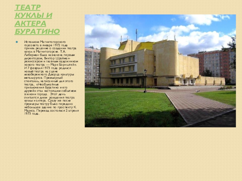 принял решение о создании театра кукол в Магнитогорске. Т.А.Либерман была назначена первым директором, Виктор Шрайман- режиссером и главным художником нового театра — Марк Борнштейн.