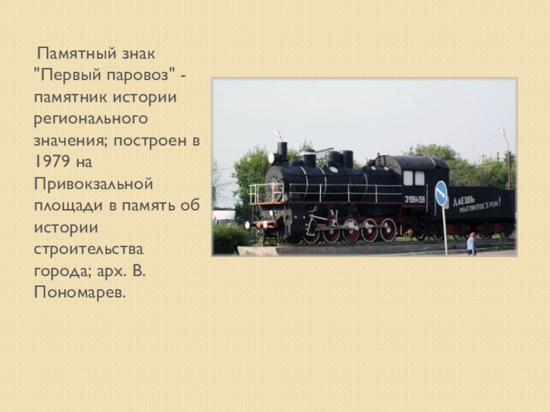 Слайд 5 Памятный знак "Первый паровоз" - памятник истории регионального значения; построен