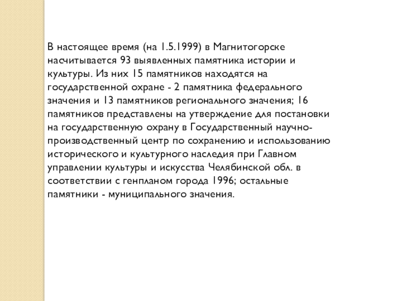Слайд 2В настоящее время (на 1.5.1999) в Магнитогорске насчитывается 93 выявленных памятника