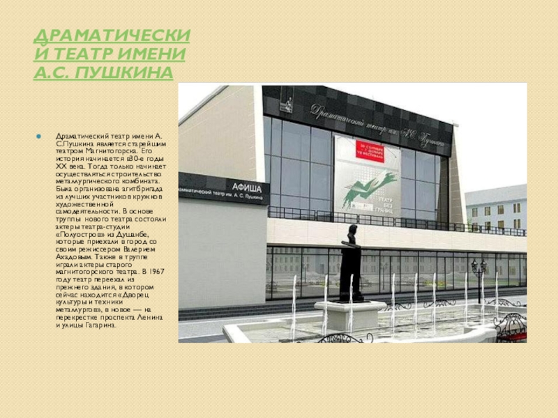 Слайд 13Драматический театр имени А.С. Пушкина