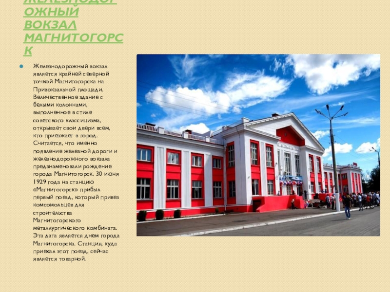 площади. Величественное здание с белыми колоннами, выполненное в стиле советского классицизма, открывает свои двери всем, кто приезжает в город. Считается, что именно появление железной дороги и железнодорожного вокзала предзнаменовали рождение города Магнитогорск. 30 июня 1929 года на станцию «Магнитогорск» прибыл первый поезд, который привез комсомольцев для строительства Магнитогорского металлургического комбината. Эта дата является днем города Магнитогорска. Станция, куда приехал этот поезд, сейчас является товарной.
