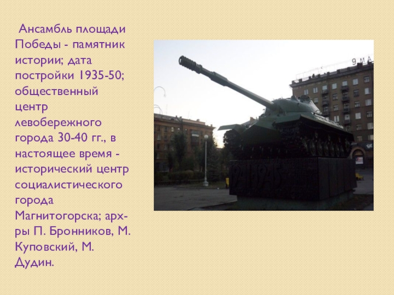 центр левобережного города 30-40 гг., в настоящее время - исторический центр социалистического города Магнитогорска; арх-ры П. Бронников, М. Куповский, М. Дудин.