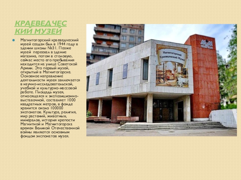 школы №31. Позже музей переехал в здание магазина, потом в столовую, сейчас место его пребывания находится на улице Советской Армии. Это первый музей, открытый в Магнитогорске. Основное направление деятельности музея заключается в научно-исследовательской, учебной и культурно-массовой работе. Площадь музея, относящаяся к экспозиционно-выставочной, составляет 1000 квадратных метров, в фонде хранится около 100000 экспонатов. Культура, религия, мир растений, животных, минералов, история крепости Магнитной и Магнитогорска времен Великой Отечественной войны являются основным фондом экспонатов музея.