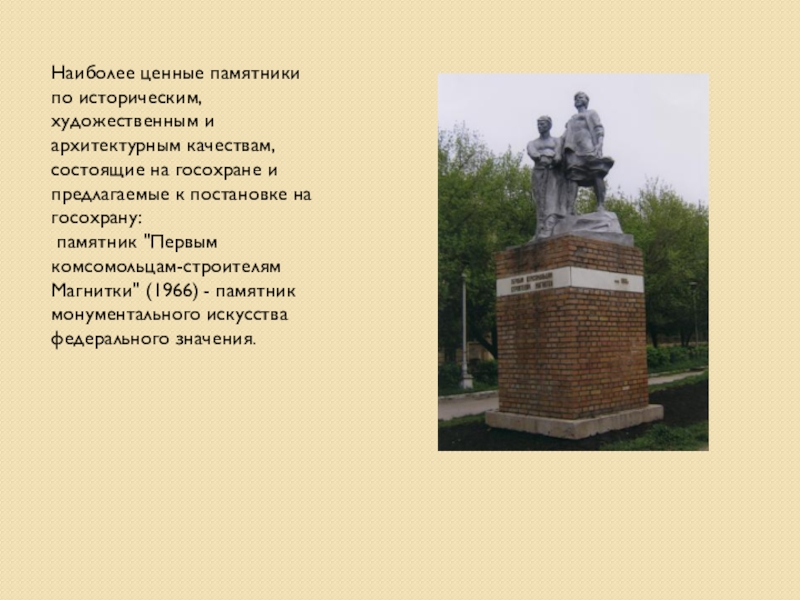 памятник "Первым комсомольцам-строителям Магнитки" (1966) - памятник монументального искусства федерального значения.