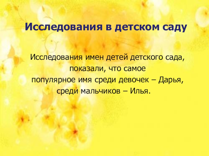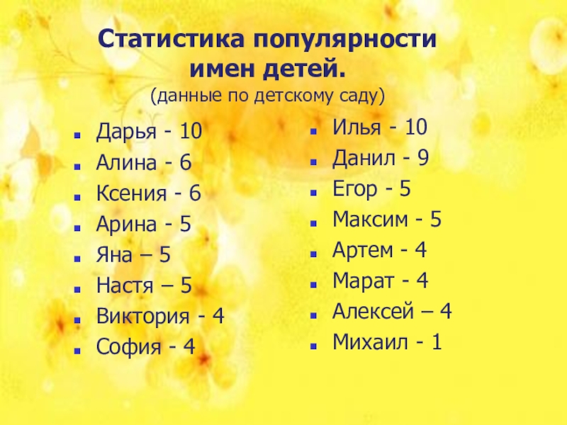 Изучить списки воспитанников д/сада с целью определения частоты употребления имён