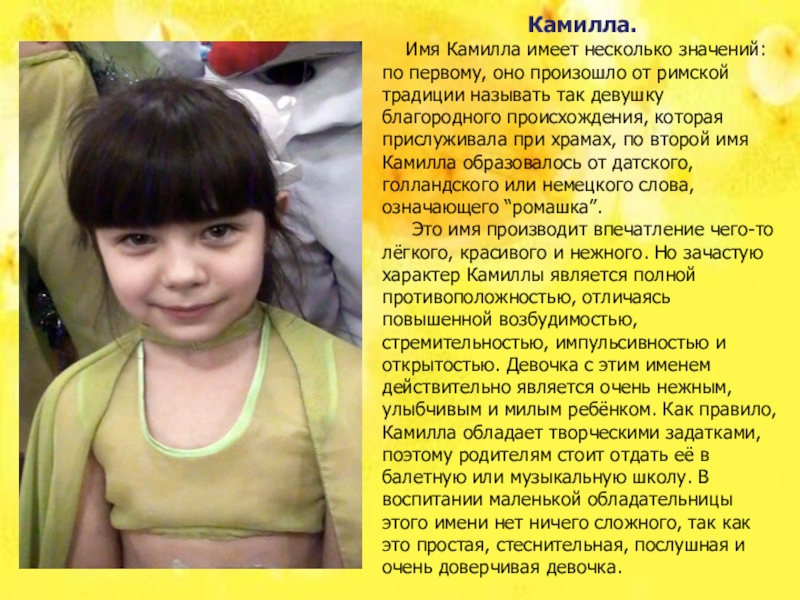 Это имя производит впечатление чего-то лёгкого, красивого и нежного. Но зачастую характер Камиллы является полной противоположностью, отличаясь повышенной возбудимостью, стремительностью, импульсивностью и открытостью. Девочка с этим именем действительно является очень нежным, улыбчивым и милым ребёнком. Как правило, Камилла обладает творческими задатками, поэтому родителям стоит отдать её в балетную или музыкальную школу. В воспитании маленькой обладательницы этого имени нет ничего сложного, так как это простая, стеснительная, послушная и очень доверчивая девочка.