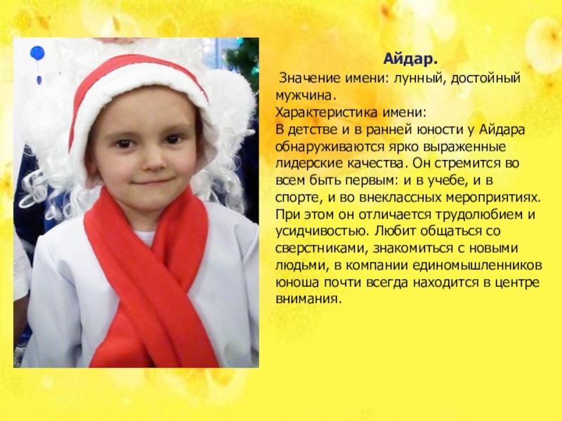 ранней юности у Айдара обнаруживаются ярко выраженные лидерские качества. Он стремится во всем быть первым: и в учебе, и в спорте, и во внеклассных мероприятиях. При этом он отличается трудолюбием и усидчивостью. Любит общаться со сверстниками, знакомиться с новыми людьми, в компании единомышленников юноша почти всегда находится в центре внимания.