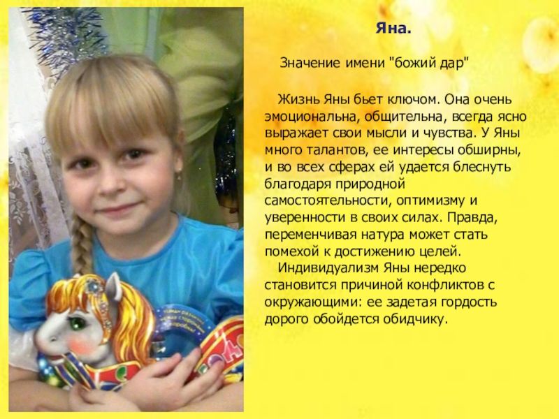 Жизнь Яны бьет ключом. Она очень эмоциональна, общительна, всегда ясно выражает свои мысли и чувства. У Яны много талантов, ее интересы обширны, и во всех сферах ей удается блеснуть благодаря природной самостоятельности, оптимизму и уверенности в своих силах. Правда, переменчивая натура может стать помехой к достижению целей.