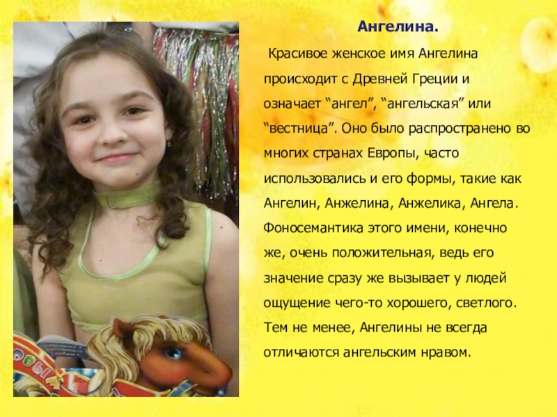 “ангел”, “ангельская” или “вестница”. Оно было распространено во многих странах Европы, часто использовались и его формы, такие как Ангелин, Анжелина, Анжелика, Ангела. Фоносемантика этого имени, конечно же, очень положительная, ведь его значение сразу же вызывает у людей ощущение чего-то хорошего, светлого. Тем не менее, Ангелины не всегда отличаются ангельским нравом.