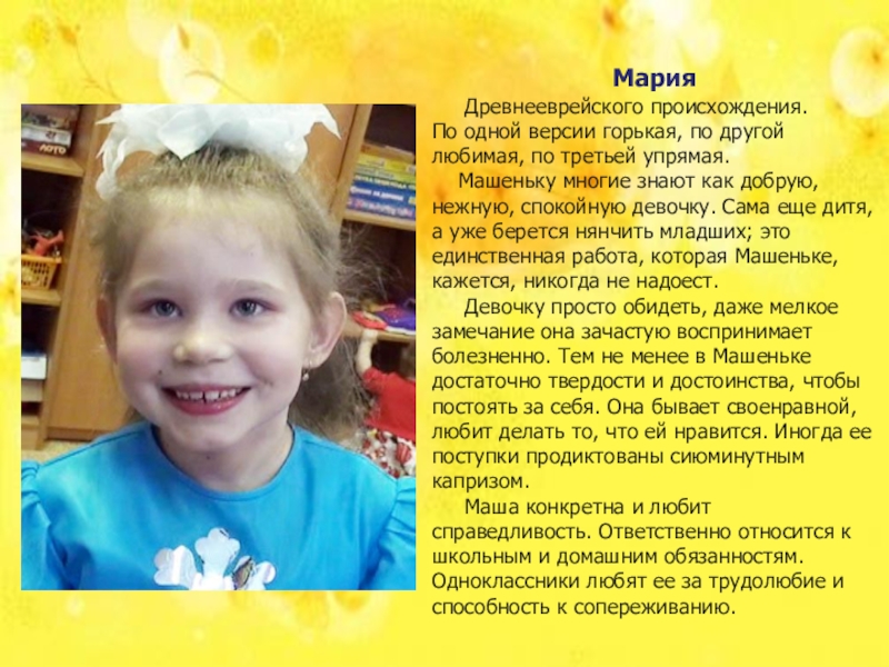 Девочку просто обидеть, даже мелкое замечание она зачастую воспринимает болезненно. Тем не менее в Машеньке достаточно твердости и достоинства, чтобы постоять за себя. Она бывает своенравной, любит делать то, что ей нравится. Иногда ее поступки продиктованы сиюминутным капризом.