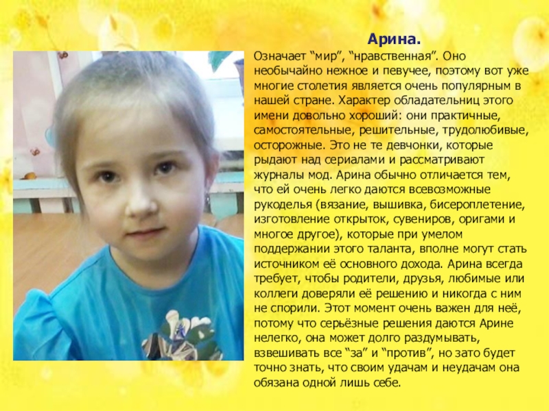 уже многие столетия является очень популярным в нашей стране. Характер обладательниц этого имени довольно хороший: они практичные, самостоятельные, решительные, трудолюбивые, осторожные. Это не те девчонки, которые рыдают над сериалами и рассматривают журналы мод. Арина обычно отличается тем, что ей очень легко даются всевозможные рукоделья (вязание, вышивка, бисероплетение, изготовление открыток, сувениров, оригами и многое другое), которые при умелом поддержании этого таланта, вполне могут стать источником её основного дохода. Арина всегда требует, чтобы родители, друзья, любимые или коллеги доверяли её решению и никогда с ним не спорили. Этот момент очень важен для неё, потому что серьёзные решения даются Арине нелегко, она может долго раздумывать, взвешивать все “за” и “против”, но зато будет точно знать, что своим удачам и неудачам она обязана одной лишь себе.