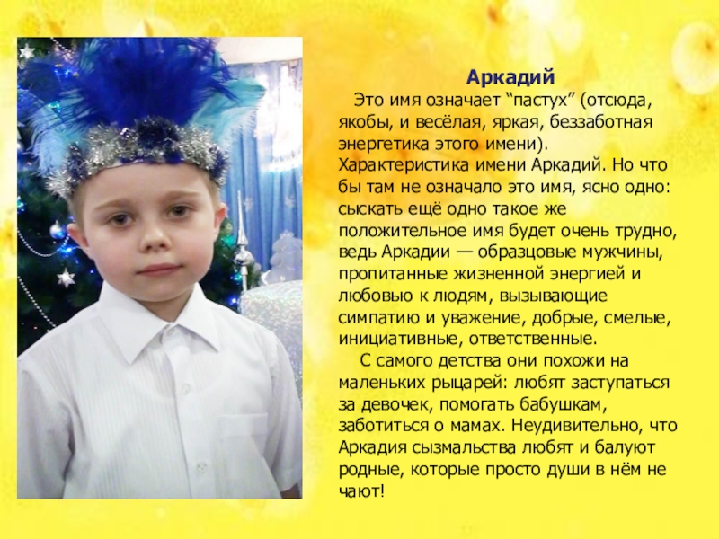 беззаботная энергетика этого имени). Характеристика имени Аркадий. Но что бы там не означало это имя, ясно одно: сыскать ещё одно такое же положительное имя будет очень трудно, ведь Аркадии — образцовые мужчины, пропитанные жизненной энергией и любовью к людям, вызывающие симпатию и уважение, добрые, смелые, инициативные, ответственные.