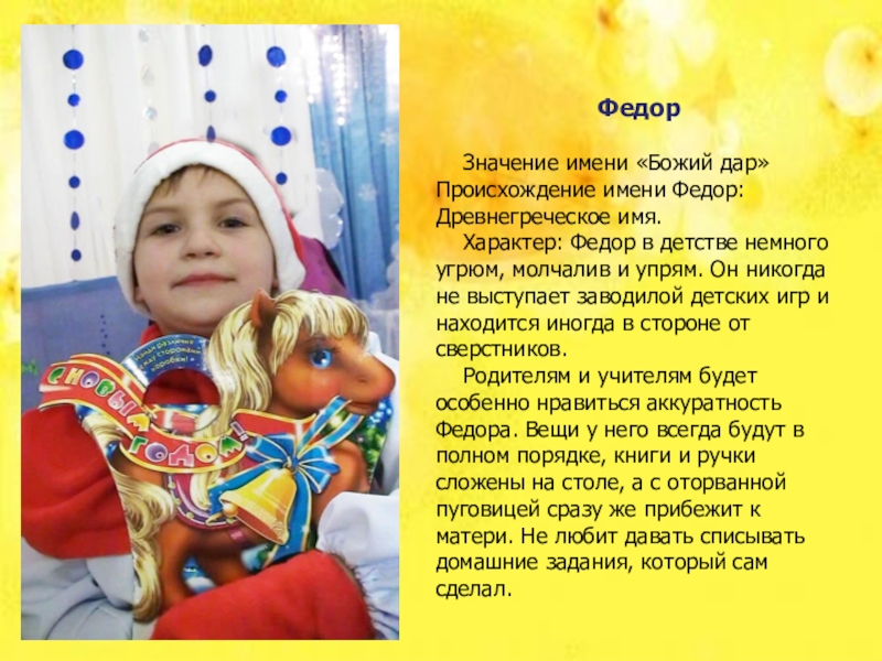 Характер: Федор в детстве немного угрюм, молчалив и упрям. Он никогда не выступает заводилой детских игр и находится иногда в стороне от сверстников.