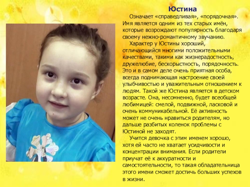 Характер у Юстины хороший, отличающийся многими положительными качествами, такими как жизнерадостность, дружелюбие, бескорыстность, порядочность. Это и в самом деле очень приятная особа, всегда поднимающая настроение своей улыбчивостью и уважительным отношением к людям. Такой же Юстина является в детском возрасте. Она, несомненно, будет всеобщей любимицей: смелой, подвижной, ласковой и очень коммуникабельной. Её активность может не очень нравиться родителям, но дальше разбитых коленок проблемы с Юстиной не заходят.