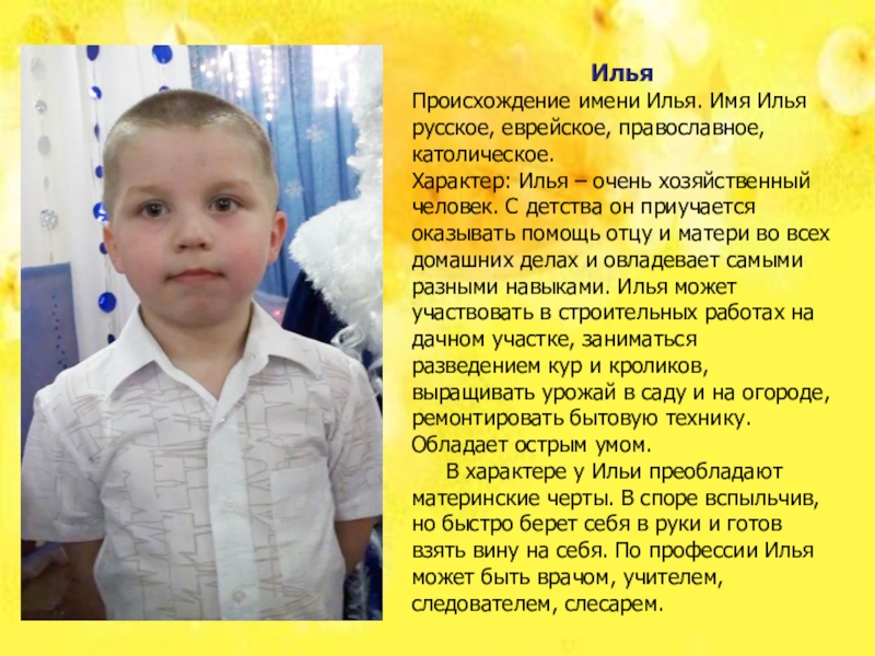 В характере у Ильи преобладают материнские черты. В споре вспыльчив, но быстро берет себя в руки и готов взять вину на себя. По профессии Илья может быть врачом, учителем, следователем, слесарем.