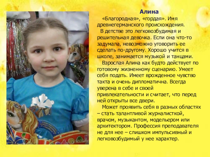 Взрослая Алина как будто действует по готовому жизненному сценарию. Умеет себя подать. Имеет врожденное чувство такта и очень дипломатична. Всегда уверена в себе и своей привлекательности и считает, что перед ней открыты все двери.