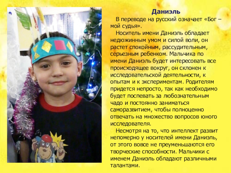 Носитель имени Даниэль обладает недюжинным умом и силой воли, он растет спокойным, рассудительным, серьезным ребенком. Мальчика по имени Даниэль будет интересовать все происходящее вокруг, он склонен к исследовательской деятельности, к опытам и к экспериментам. Родителям придется непросто, так как необходимо будет поспевать за любознательным чадо и постоянно заниматься саморазвитием, чтобы полноценно отвечать на множество вопросов юного исследователя.