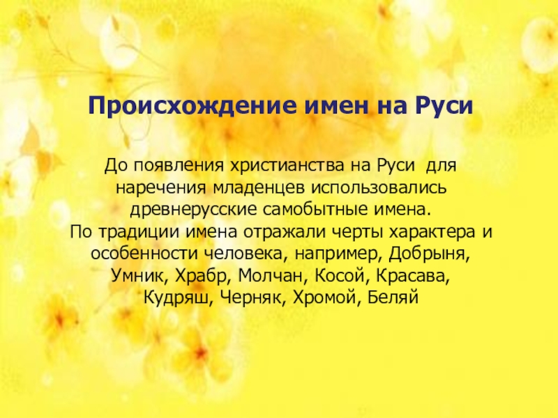 По традиции имена отражали черты характера и особенности человека, например, Добрыня, Умник, Храбр, Молчан, Косой, Красава,
