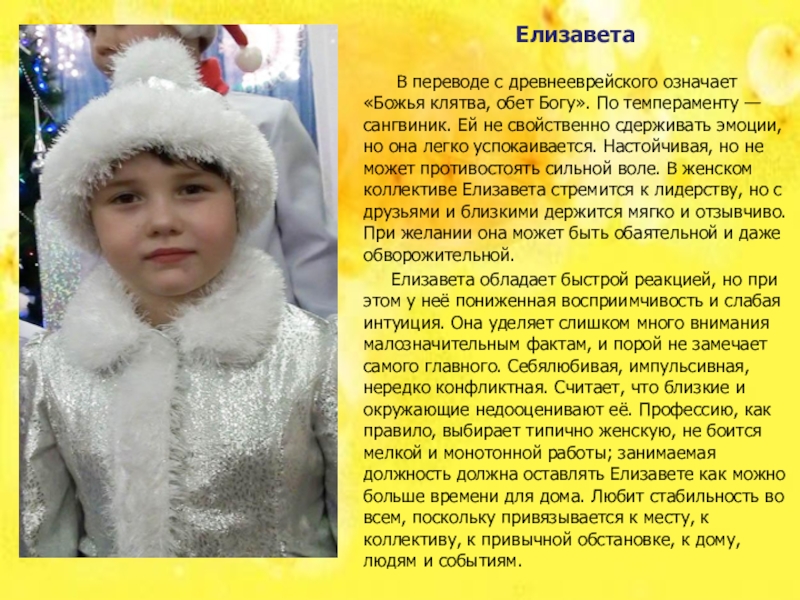 Богу». По темпераменту — сангвиник. Ей не свойственно сдерживать эмоции, но она легко успокаивается. Настойчивая, но не может противостоять сильной воле. В женском коллективе Елизавета стремится к лидерству, но с друзьями и близкими держится мягко и отзывчиво. При желании она может быть обаятельной и даже обворожительной.