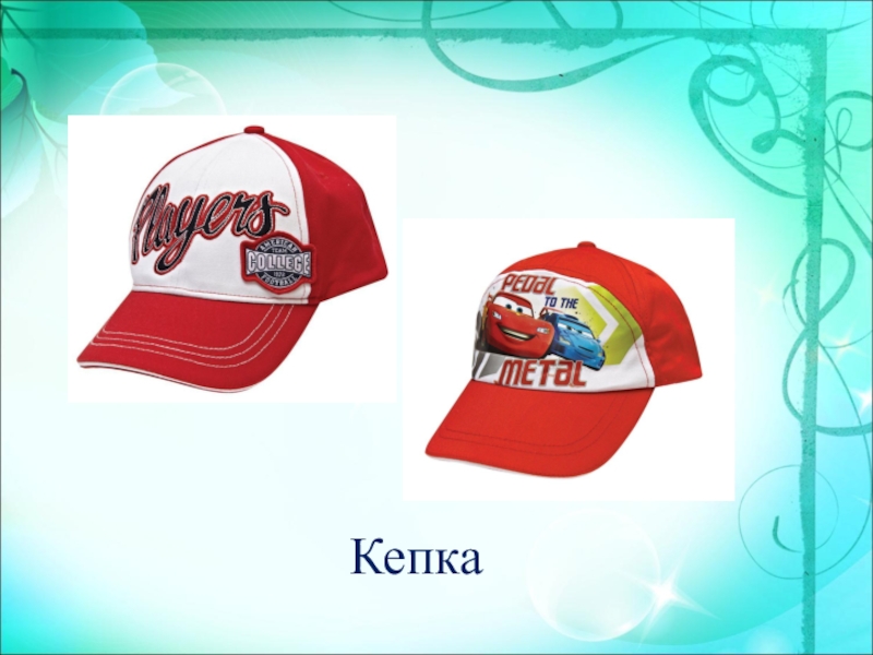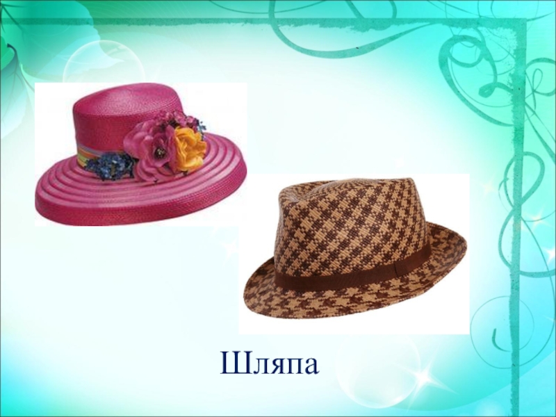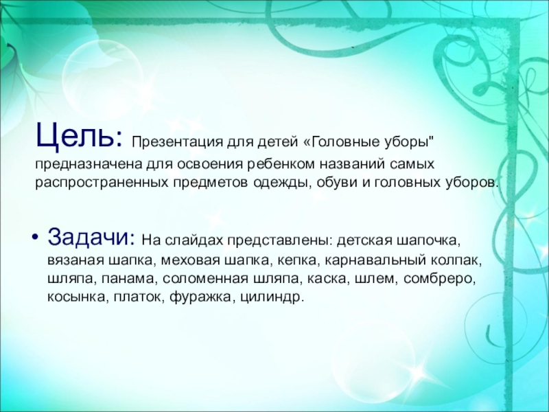 Задачи: На слайдах представлены: детская шапочка, вязаная шапка, меховая шапка, кепка, карнавальный колпак, шляпа, панама, соломенная шляпа, каска, шлем, сомбреро, косынка, платок, фуражка, цилиндр.