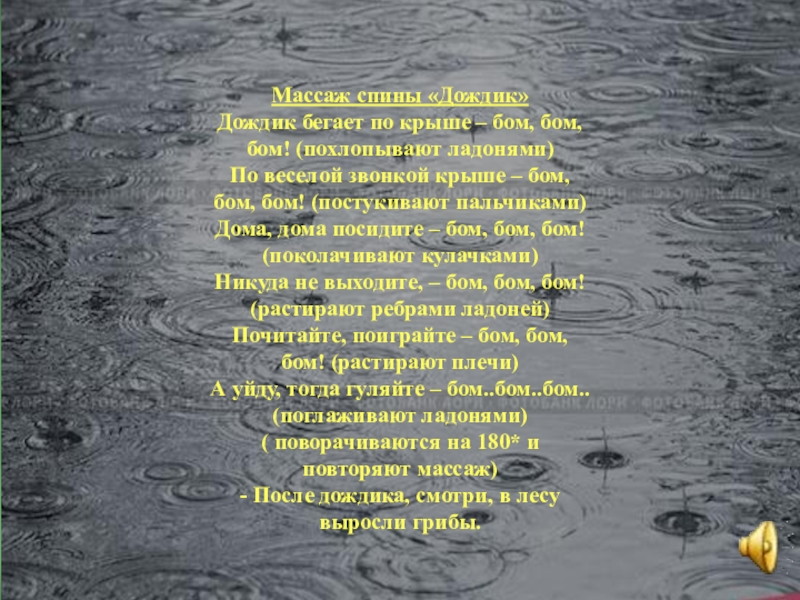 ладонями) По веселой звонкой крыше – бом, бом, бом! (постукивают пальчиками) Дома, дома посидите – бом, бом, бом! (поколачивают кулачками) Никуда не выходите, – бом, бом, бом! (растирают ребрами ладоней) Почитайте, поиграйте – бом, бом, бом! (растирают плечи) А уйду, тогда гуляйте – бом..бом..бом.. (поглаживают ладонями) ( поворачиваются на 180* и повторяют массаж) - После дождика, смотри, в лесу выросли грибы.