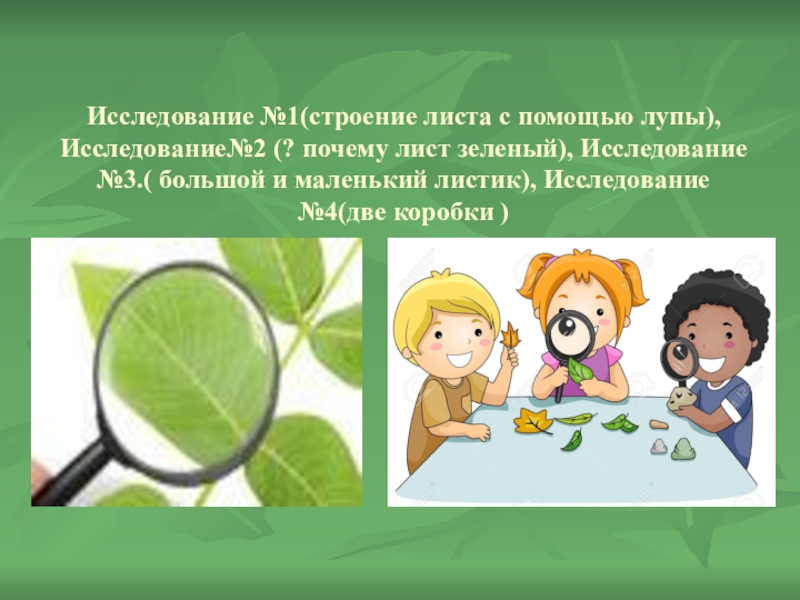 Исследование №1(строение листа с помощью лупы), Исследование№2 (? почему лист зеленый), Исследование №3.( большой и маленький листик),