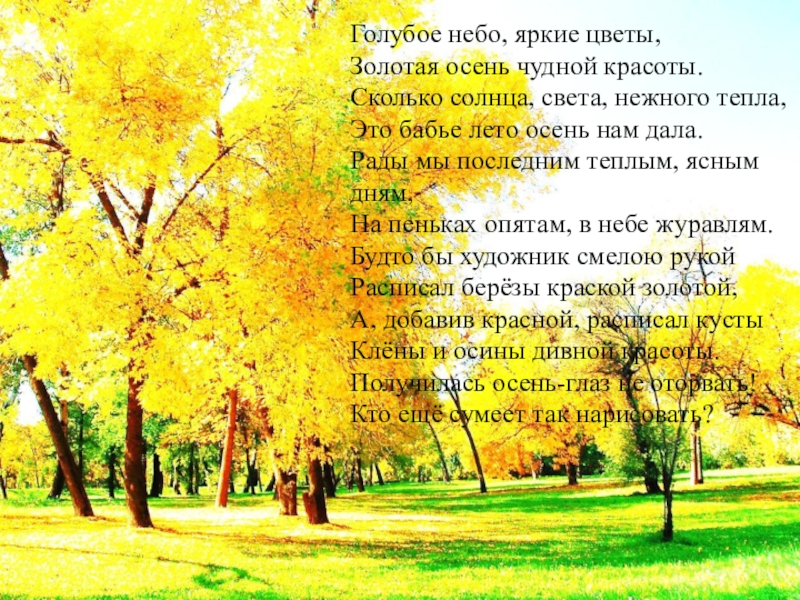 Голубое небо, яркие цветы, Золотая осень чудной красоты. Сколько солнца, света, нежного тепла, Это бабье лето осень