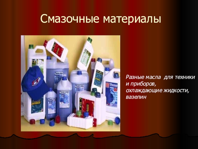 Смазочные материалыРазные масла для техники и приборов, охлаждающие жидкости, вазелин