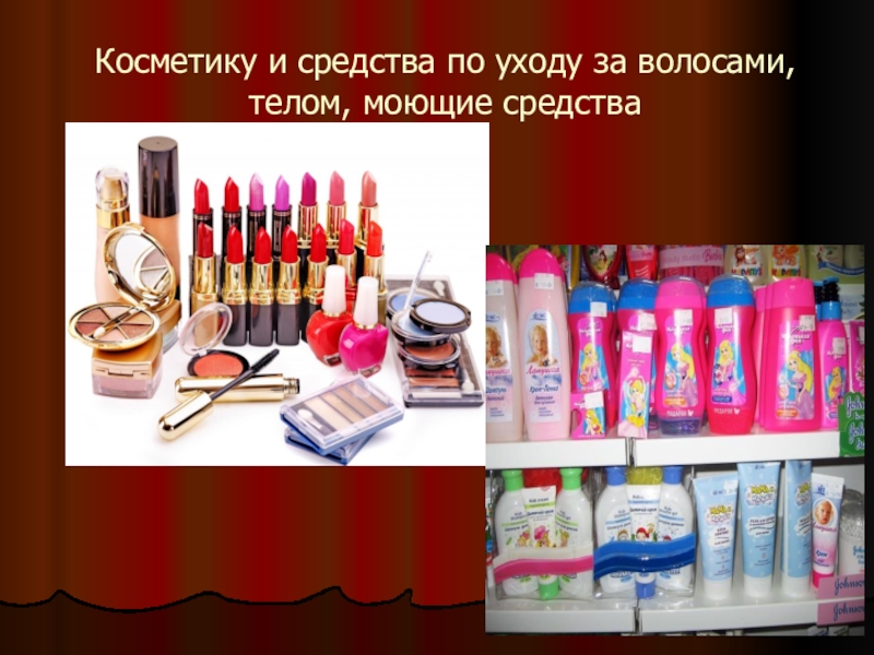 Слайд 7Косметику и средства по уходу за волосами, телом, моющие средства