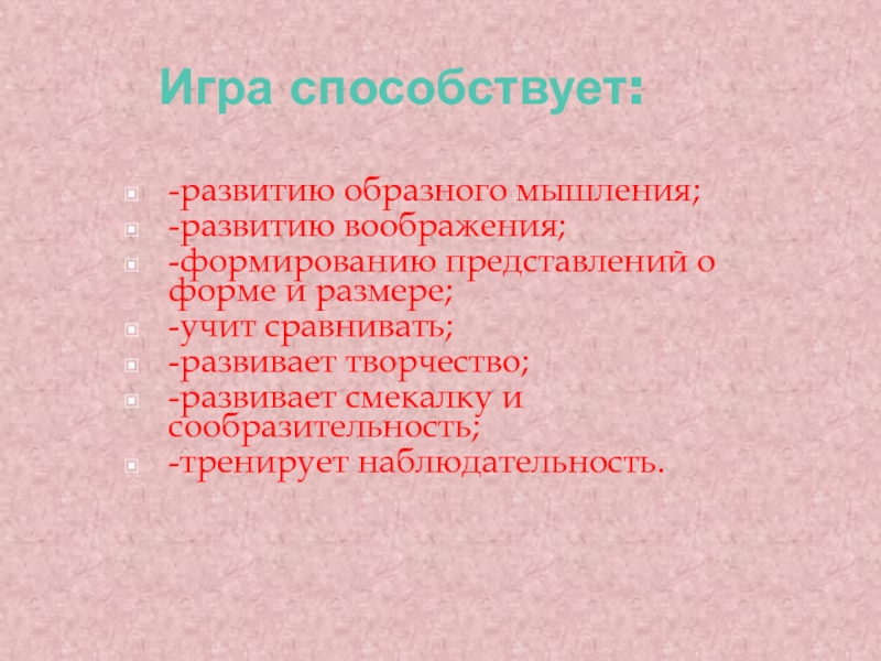 Игра способствует: -развитию образного мышления;-развитию воображения;-формированию представлений о форме и размере;-учит сравнивать;-развивает творчество;-развивает смекалку и сообразительность;-тренирует наблюдательность.