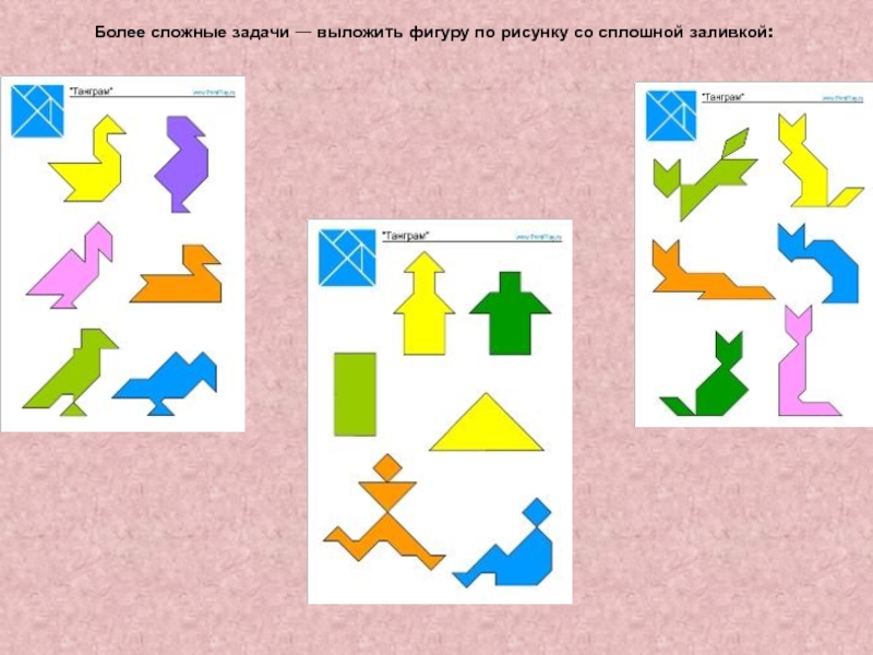 Слайд 4Более сложные задачи — выложить фигуру по рисунку со сплошной заливкой: