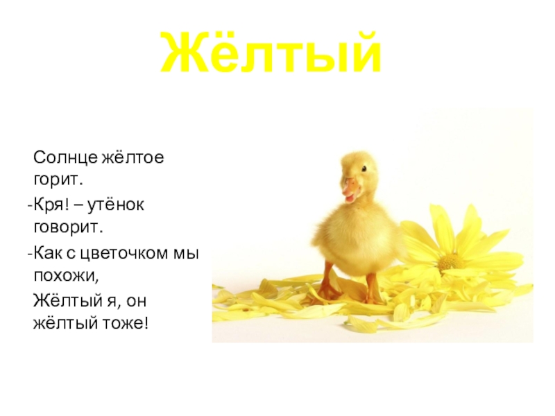 Жёлтый Солнце жёлтое горит.Кря! – утёнок говорит.Как с цветочком мы похожи,Жёлтый я, он жёлтый тоже!