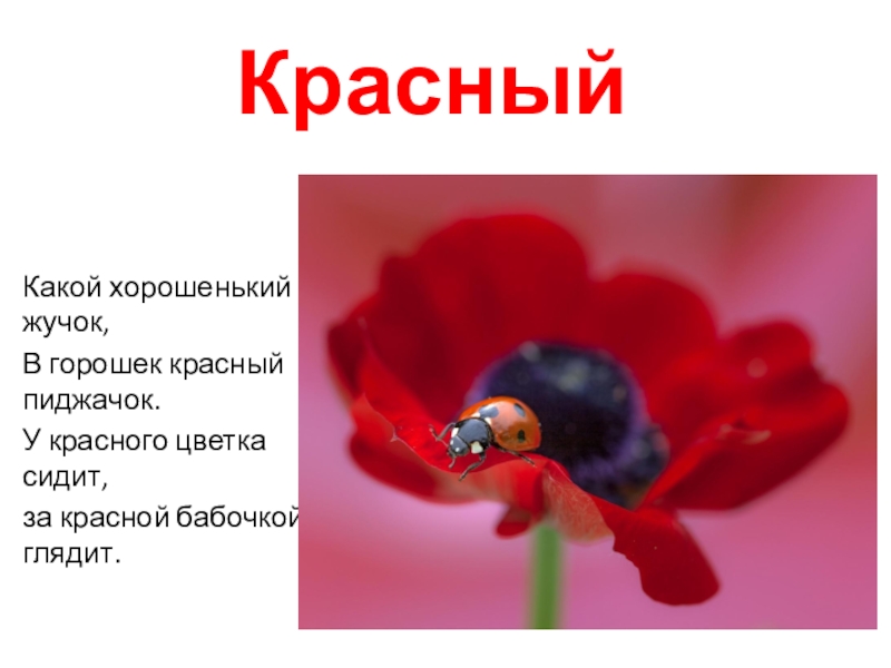 КрасныйКакой хорошенький жучок,В горошек красный пиджачок.У красного цветка сидит, за красной бабочкой глядит.