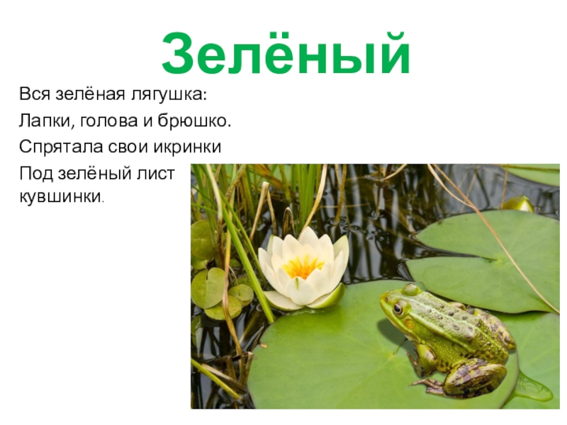 Зелёный Вся зелёная лягушка:Лапки, голова и брюшко.Спрятала свои икринкиПод зелёный лист кувшинки.