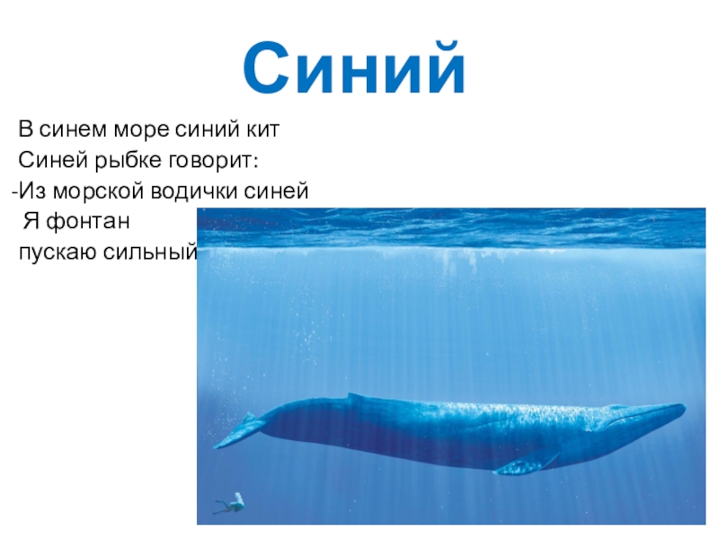 Синий В синем море синий китСиней рыбке говорит:Из морской водички синей Я фонтан пускаю сильный!
